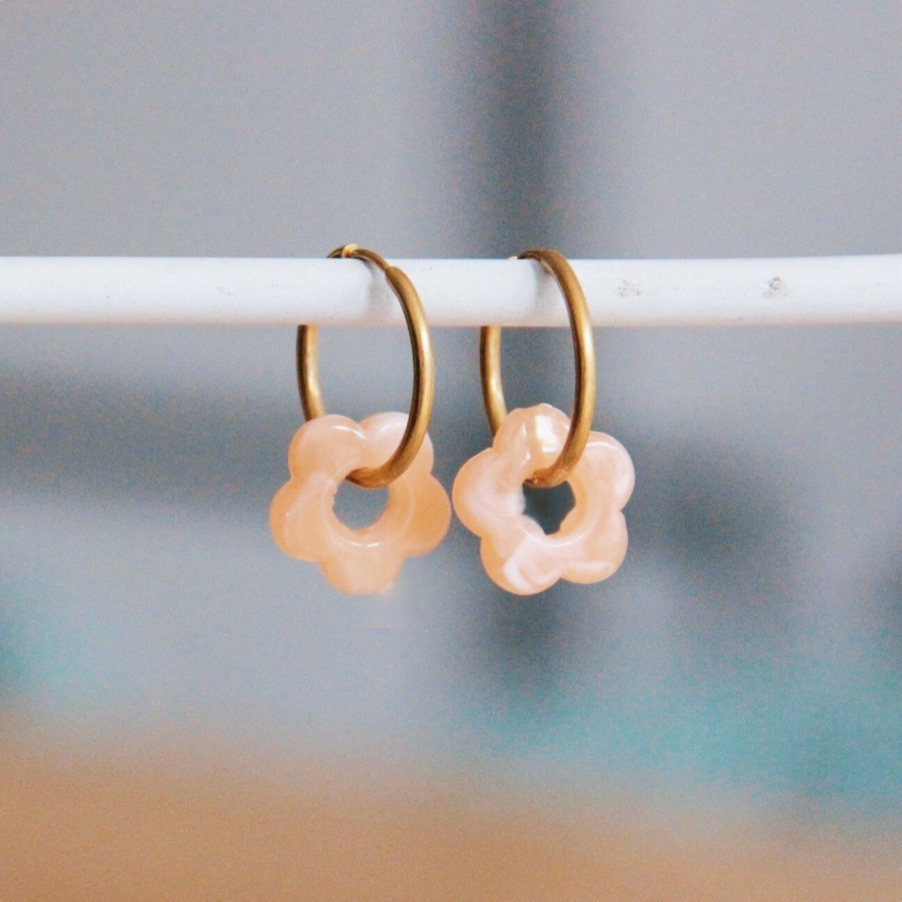 Edelstalen oorbel met kleine hars bloem – zalm/goud